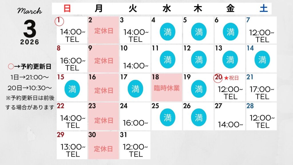 現在「3月」・「4月平日のみ」までご予約を承り中です